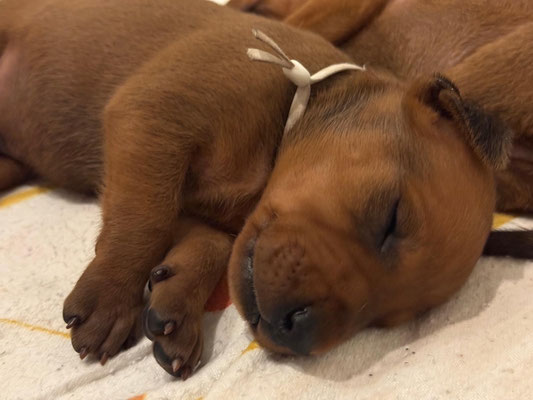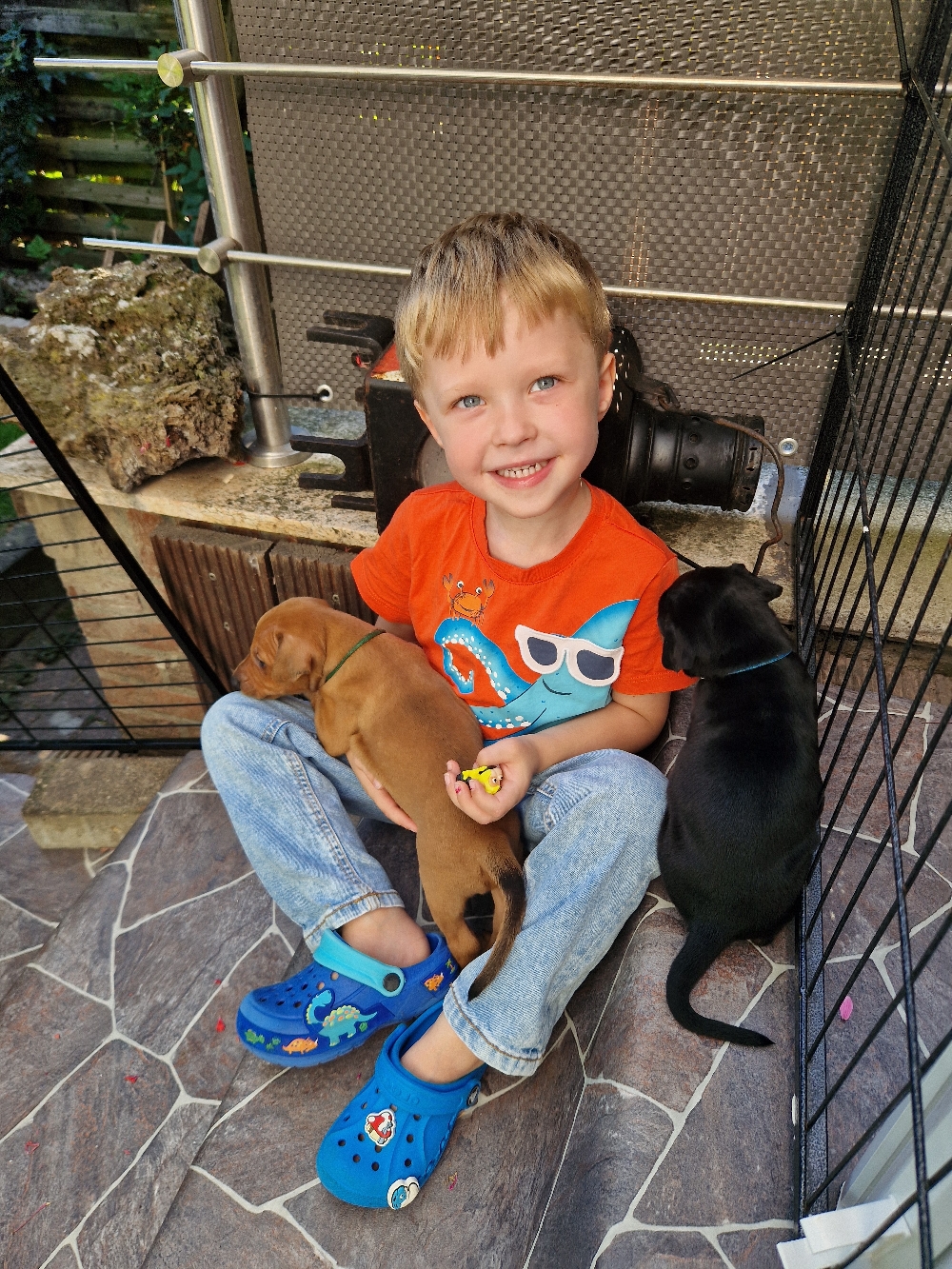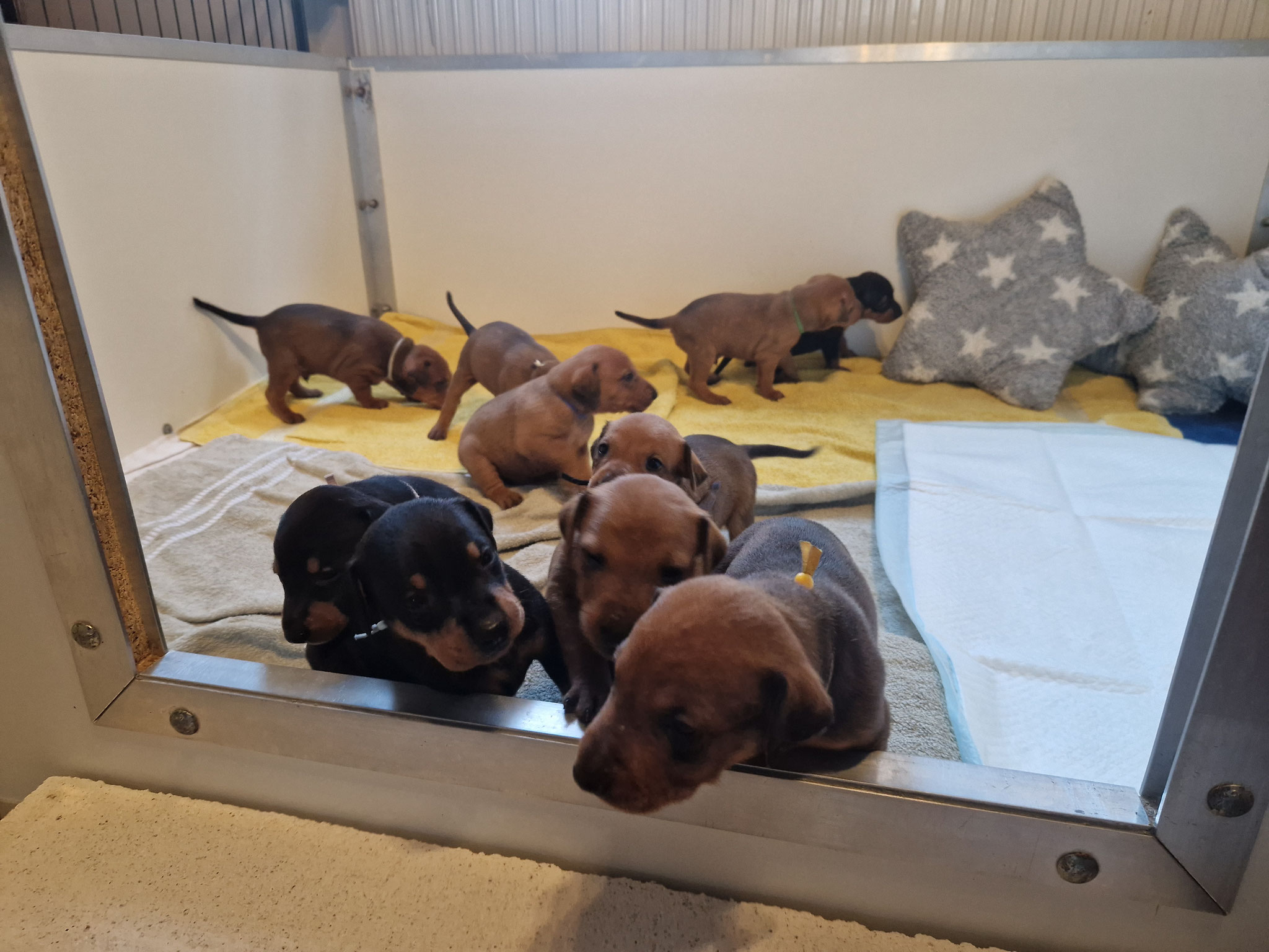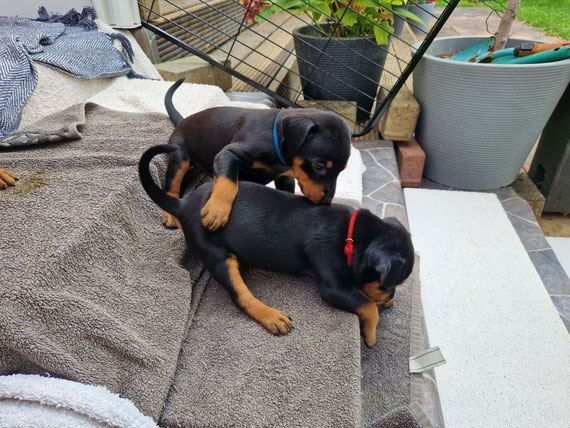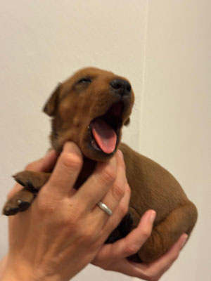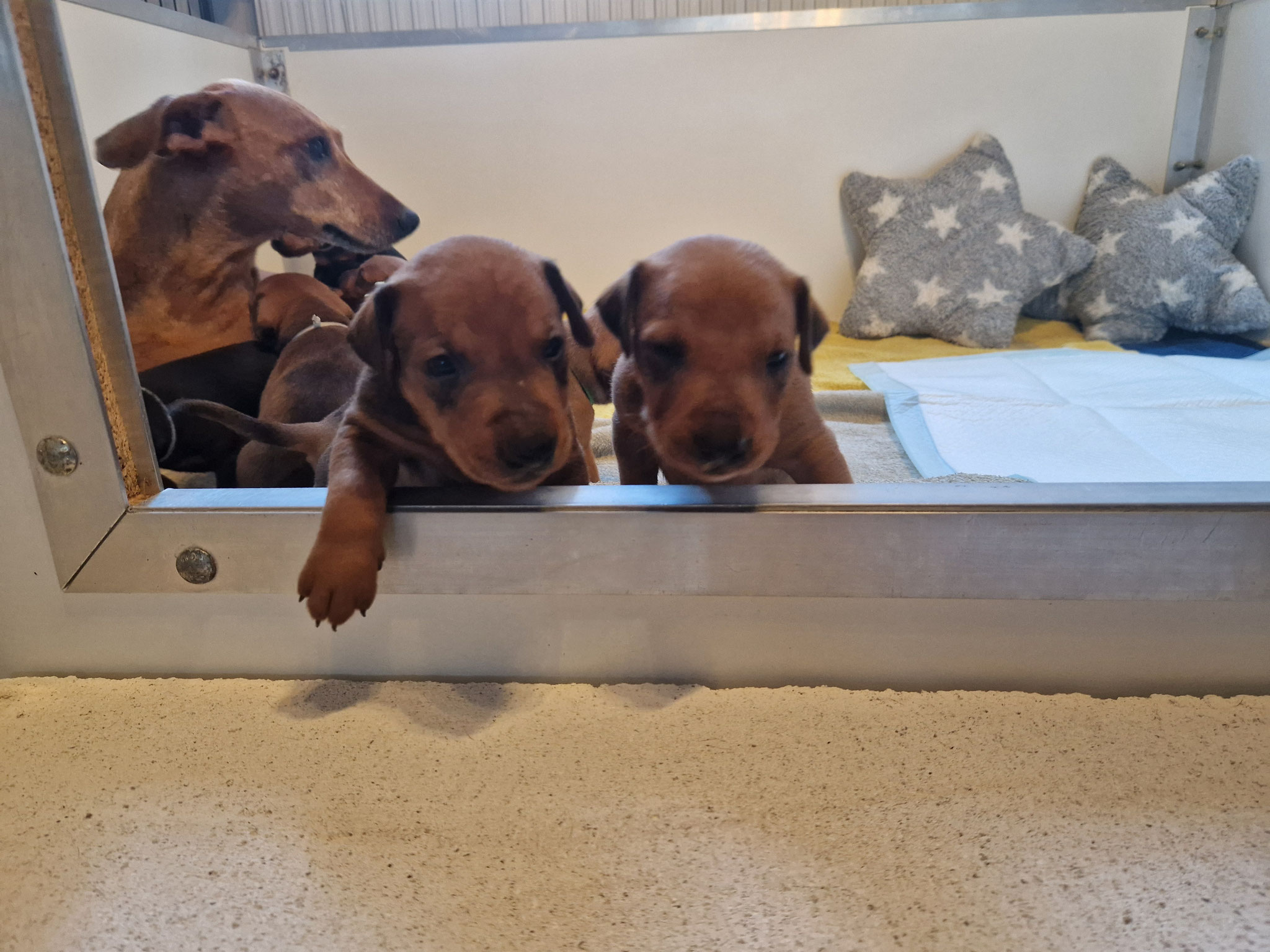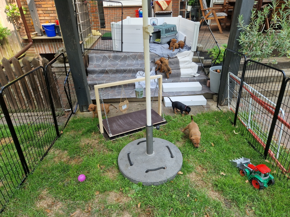 Update 09.08. Alle wachsen und gedeihen prächtig. Die Mahlzeiten schmecken aber auch hervorragend und wir trinken nur noch wenig bei der Mama. Das findet sie wegen unserer spitzen Zähnchen auch gar nicht mehr so toll. Mittlerweile erkundet die Meute auch den Auslauf draußen. Nach anfänglichem Zögern, haben sie nun jeden Tag mehr Spaß daran die Welt draußen zu erleben. Allerdings sind wir nach den Eindrücken auch schnell wieder müde :-)